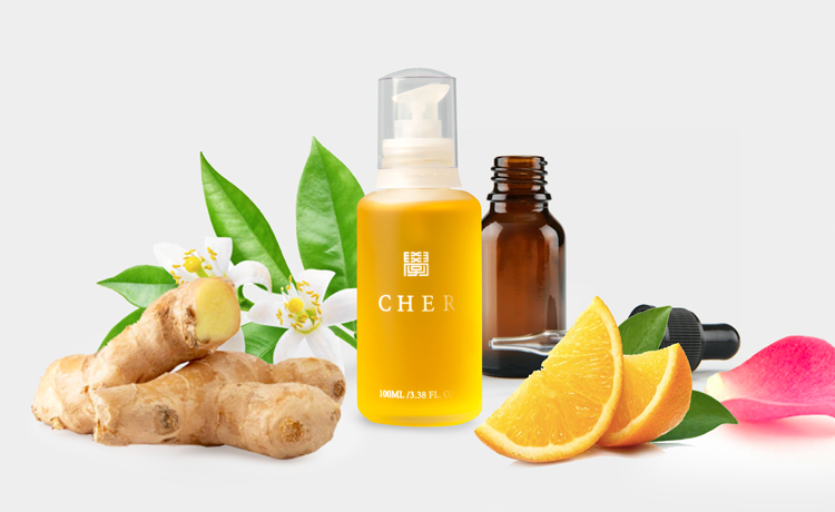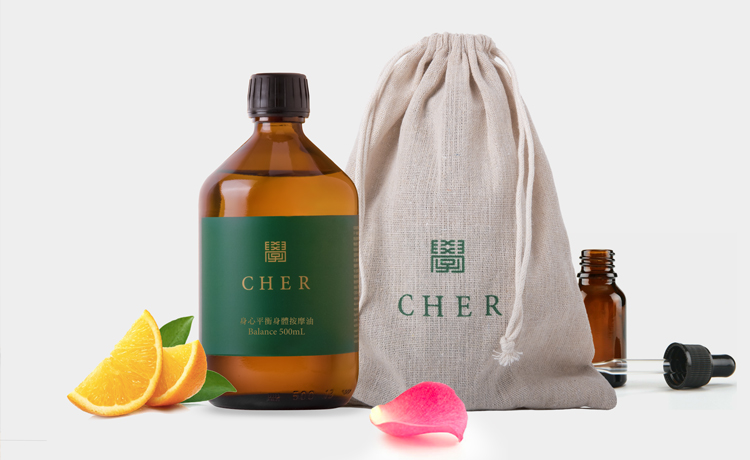 泰國品牌 Cher 學香氛精油為瑜珈師與精油調香師創立的在台灣之個人品牌,經由多年經驗與專業,提供最頂級的精油與服務,商品使用天然高級材料,在品牌與包裝上,特別強調天然、高級,因此特別聘請模特兒外拍實景情境照片,包裝上使用印金與燙金效果。
