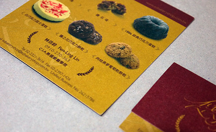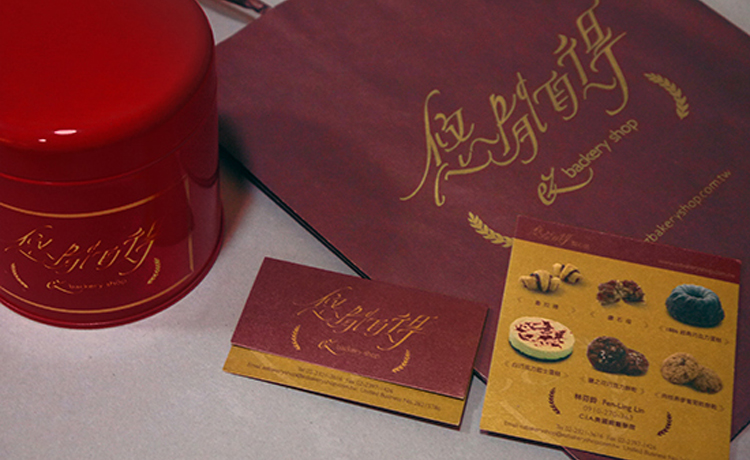 餅廚師從美國藍帶學院畢業,期望分享自己在美國所學的糕餅與甜點,因商品為高單價的點產品,所以Logo字體設計採用裝飾性線條,仿造西方的維多莉亞風格去設計,包裝上採用簡單大方的鮮紅色鋁罐,以及燙金的貼紙增加其高級感,名片與小卡採用特殊珠光紙印刷。