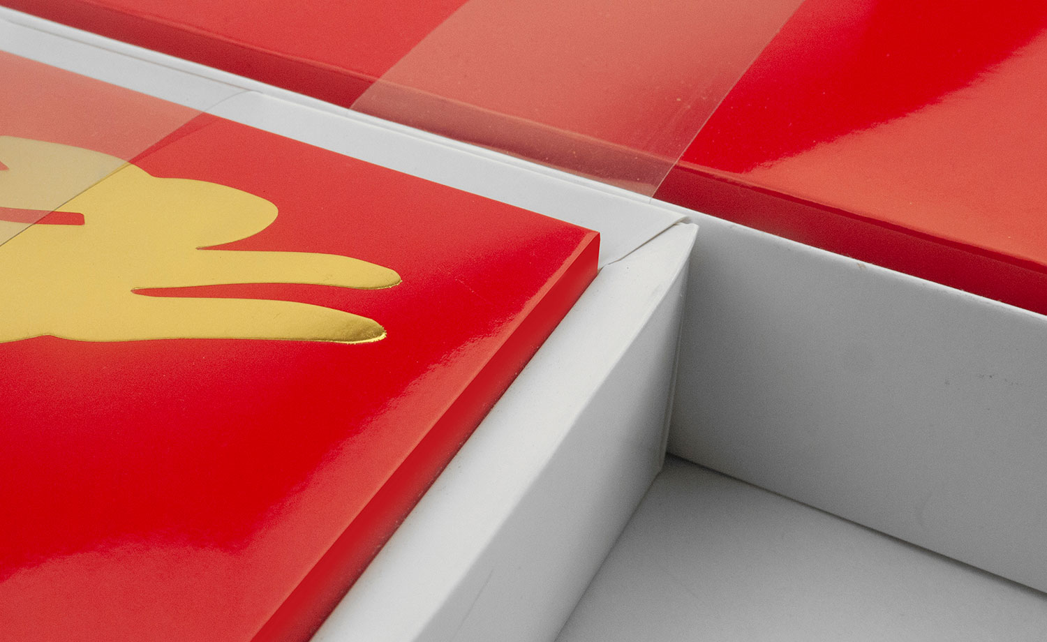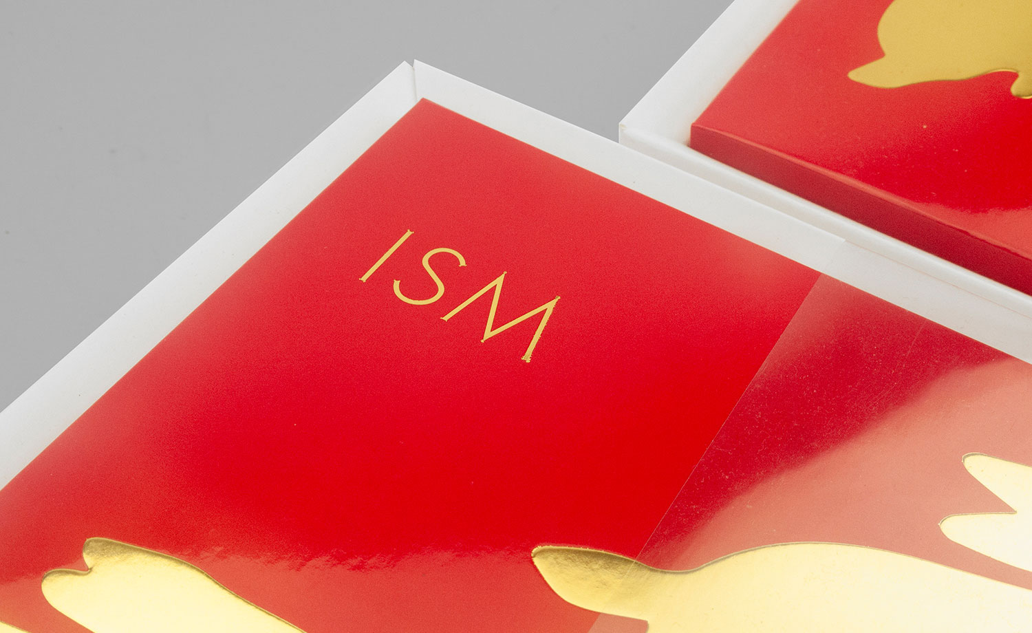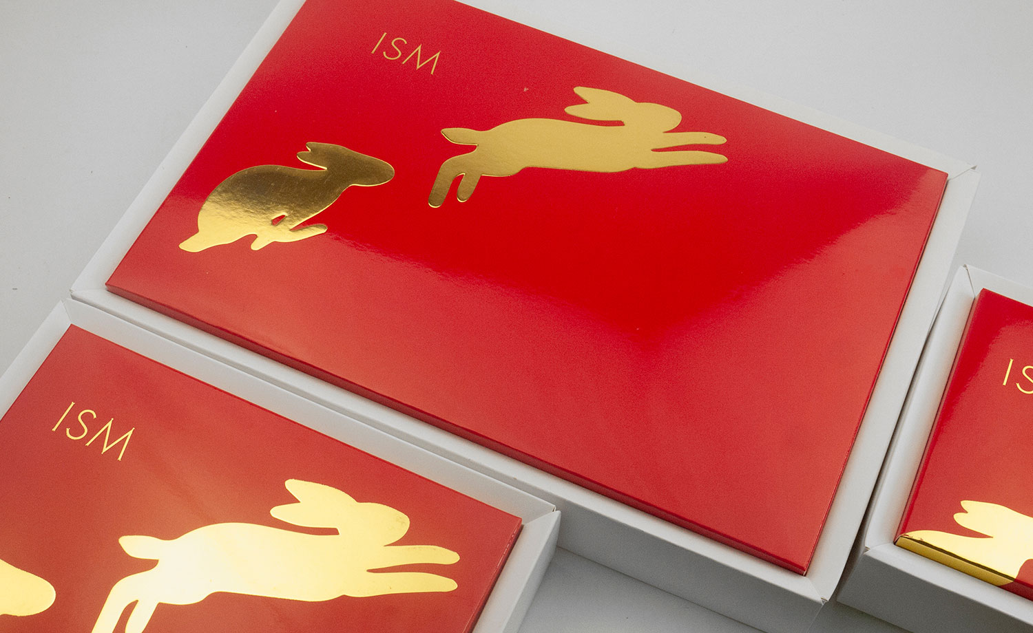 為了符合Pâtisserie ISM 主義甜時與藝術結合的品牌方向,盒型設計的底盒成類似畫框的凹陷樣式,只要更換節上蓋的圖像,就有如一張張不同的藝術畫作的呈現,非平面的折盒盒型也與其他品牌成區隔出自我品牌的獨特性。兔年禮盒包裝設計以極簡圖像設計方式呈現兔子跳耀的畫面。