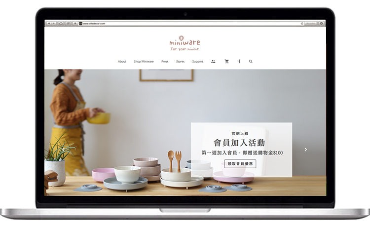 Miniware 以販售嬰幼兒生活用品為主的設計品牌,商品設計上維持極簡,並以攝影照片為主,首頁主視覺維持極簡風格,因商品注重功能與細節說明,在商品頁上做了多種版型與樣式的變化。
