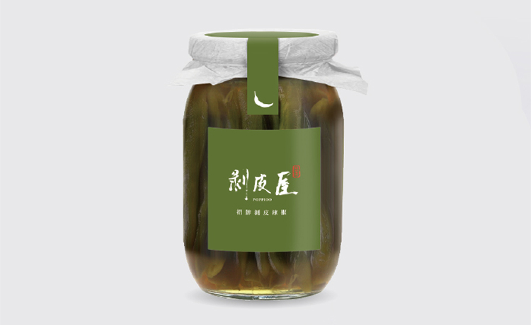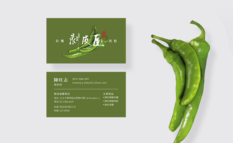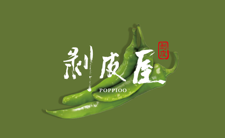 剝皮屋Poppioo 是以花蓮名產「剝皮辣椒」作為品牌之主要商品,並結合日本拉麵與日式煎餃的中、日混血的新餐飲連鎖品牌,品牌主色與主視覺元素直接以「剝皮辣椒」的顏色與形狀做設計,並與市場上大部份強調黑、紅為主的日式拉麵品牌,在色調與內容上做出「差異性」與「獨特性」,總店店面雖位於西門町的國賓戲院,但鄰近過去是「剝皮寮」的傳統街區,為做區隔,因此特別用實體的剝皮辣椒來呈現,減少訊息傳達上的誤會。